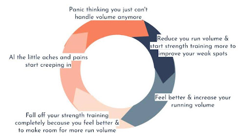 Instead of falling into the common cycle of “hit it hard in the offseason, drop it when mileage builds, and scramble when injury strikes,” this approach allows you to make continuous, sustainable progress—in your strength, your running, and your health.